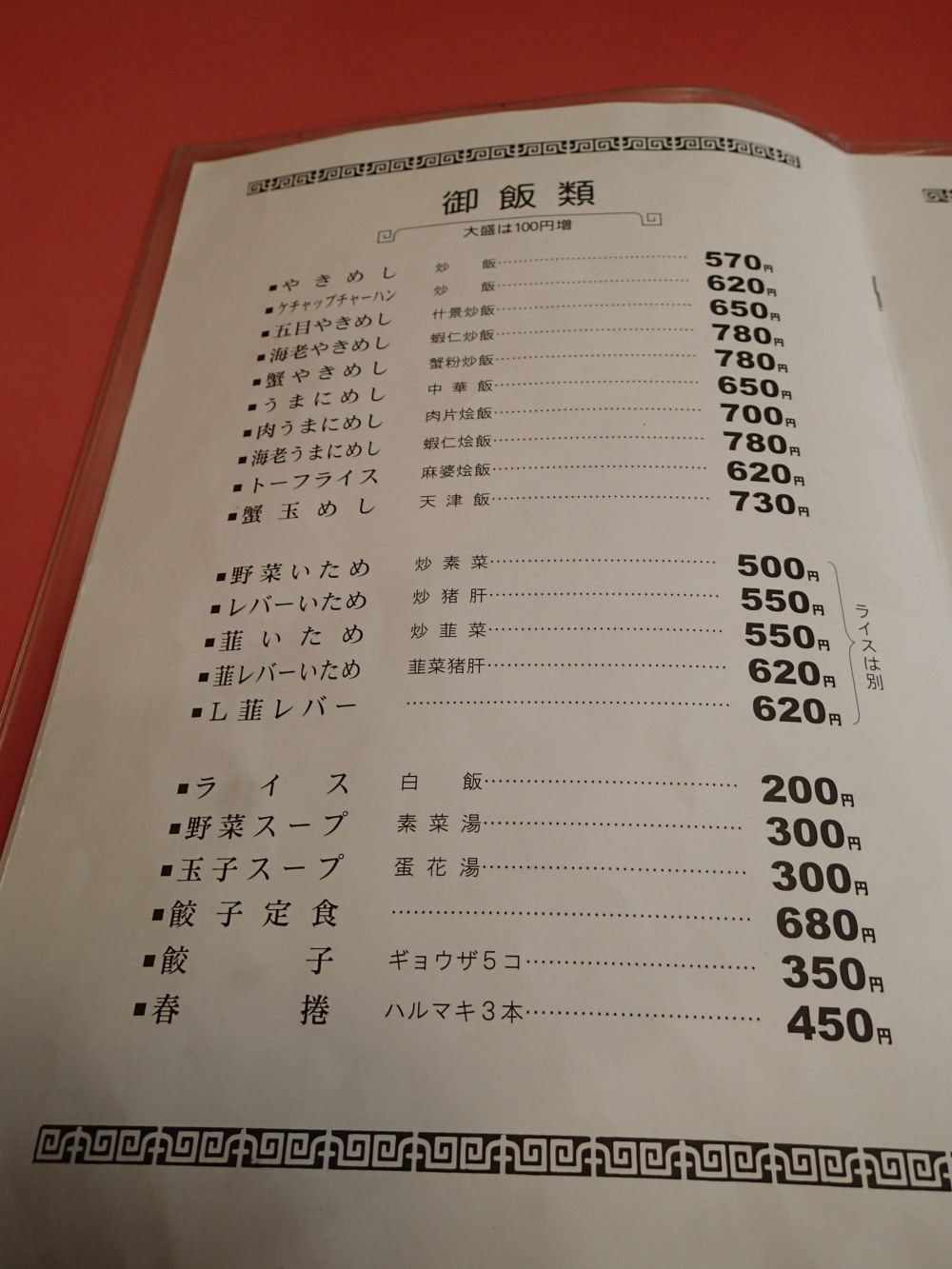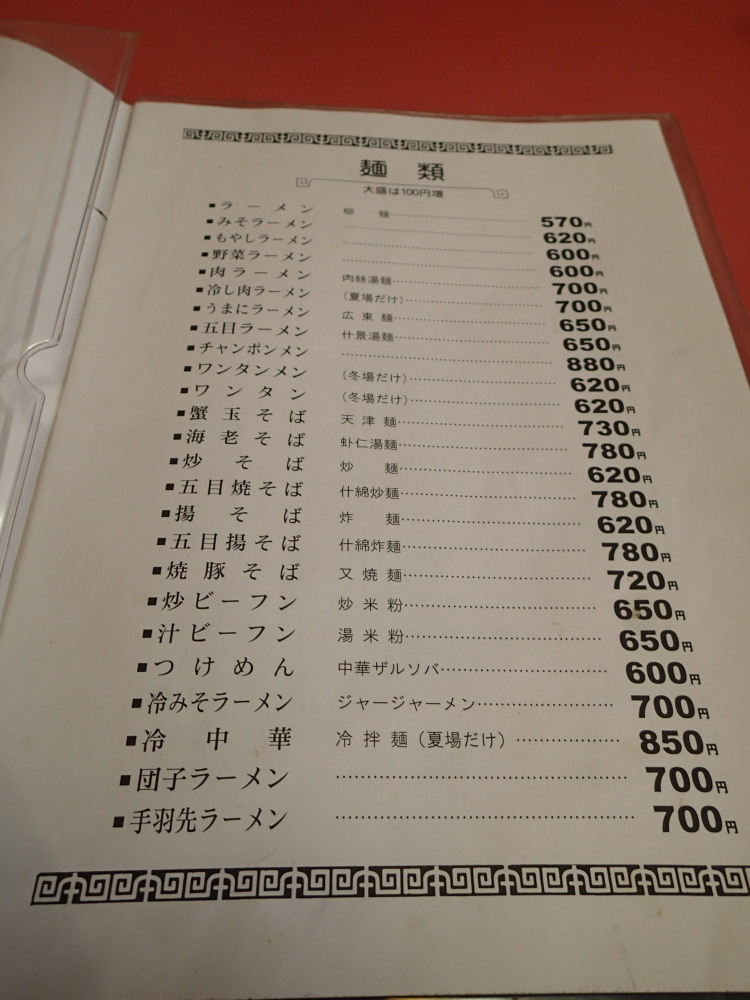 メニューの一部です。このページの他に飯のページと一品料理のページが有るんですよ。失礼ながら、あの厨房でこれだけのものが作れるとはすごい。魔法のようです。隣がヤマザワというのが一役買っているのでしょうか? と思ったりしましたがイヤイヤイヤ。