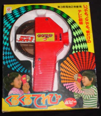 さか店にはやや高いおもちゃも少し売ってましたね。中でもこれ、くるくるテレビ。中にフィルムが入っていて、ショートムービーが見られるというもの。フィルム交換可能で、その当時10種類ほど売っていたと思う。あの当時で2000円ぐらいだったか。欲しかったからいつも棚の上にあったそれを眺めていたものです。