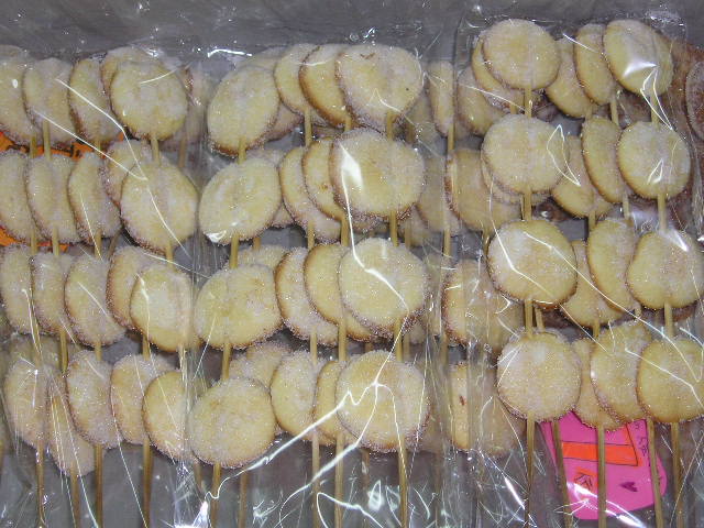 カステラ。これが大好きで、先端が赤いとアタリのパターンと、10円でくじを引き、アタリは大きなカステラドーナツ、ハズレは串が1本とか。賞味期限なんかどうなっていたのか。