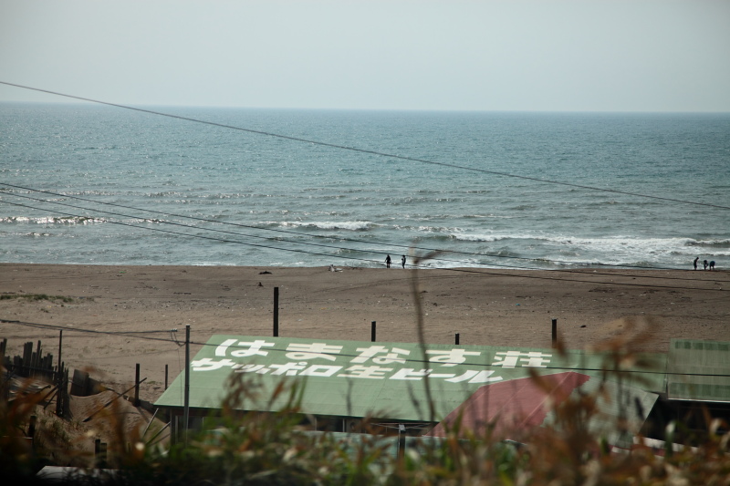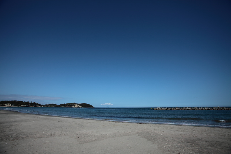 近くのだだっ広い海岸線に来てみました。菖蒲田海水浴場。海と空の境界線がくっきりはっきり。海水温と大気温の差が大きいとこうなるって聞いた事があるような。