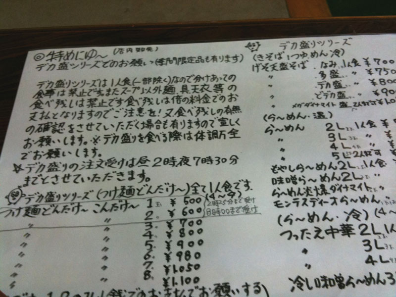 「・・・・残したら1600円じゃんか? うーん、でも・・・3人前なら食えるかな? いや、大盛りに変更した方が・・・」と悶々と悩みましたが、既に調理に入っている様子だし、ま、大丈夫だろ。と、もう一度メニューをよくよく見ると、どんだけの盛りなのか実際一度は見てみたいメニューが並んでいます。「げそ天盛りそばメガダイナマイト盛1050円」これは2人まで分担で食べて良いと言う事ですから、5人前とか(一応)書いてありますが恐らく9人前ぐらいあるかも。そうじゃないと計算が合いませんもんね。「つけ麺どんだけ~こんだけ~ツリーズ」は8人前で1100円ですよ。かなり安い価格設定だと思います。