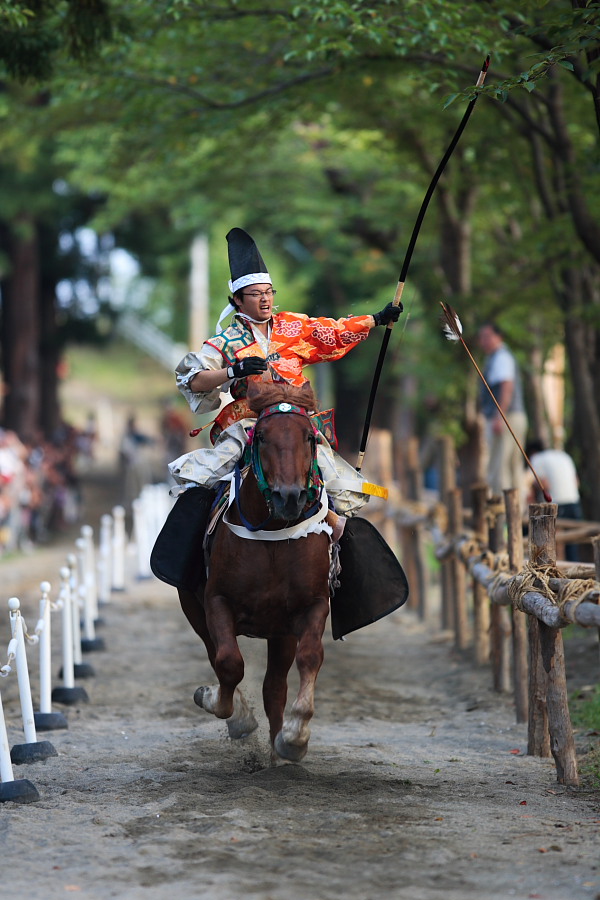 無事終了です。150mぐらいの所で矢を3本。やや重馬場でよく撃てるものですね。すごいなぁ。現代では使い道無いでしょうけど、昔の人達は頑張って訓練したのでしょうね。さすが鎌倉時代からの伝統をくむお祭りです。