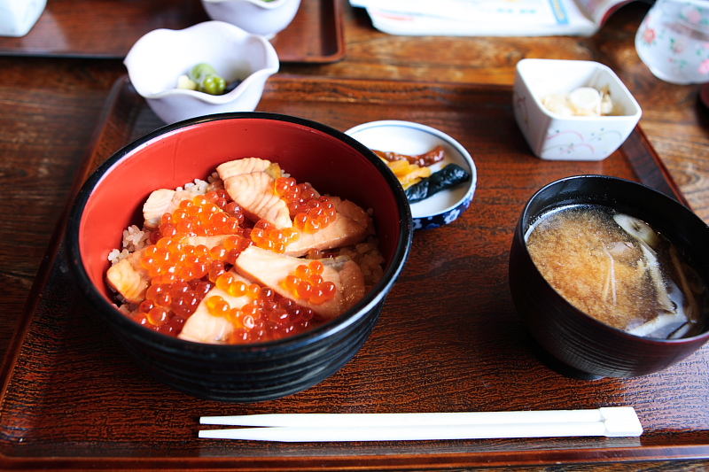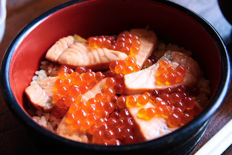 ご存じイクラと、醤油・ミリンなどで味付けしたホクホクの鮭の切り身・鮭を煮込んだ残りダシで炊いた飯。