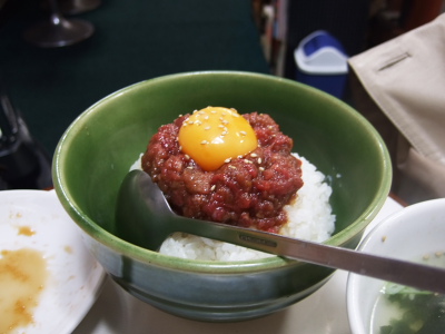 ユッケライス。生肉のボリューム満点。ランチならこれ一品で完成している。夜はアルコールで麻痺してるから・・・