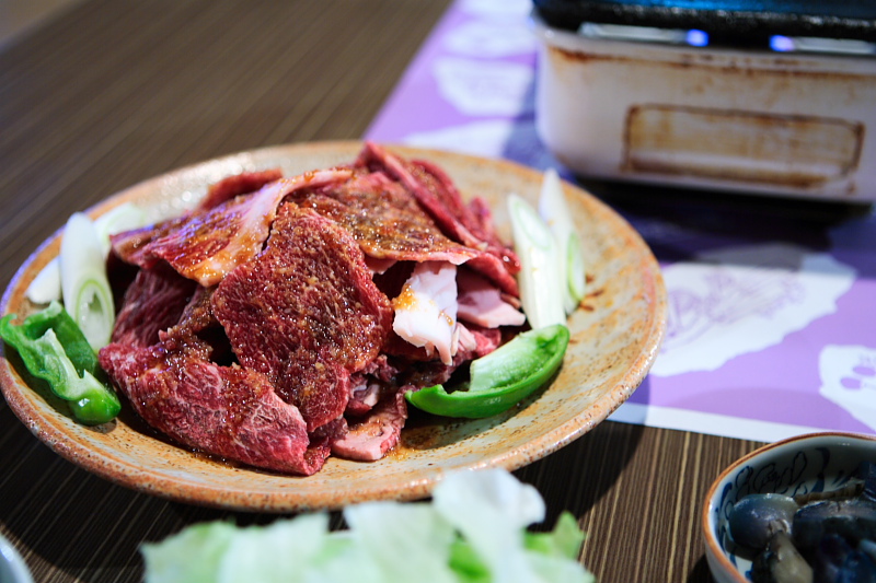 辺りを見回すと「食堂兼店主の居間」、にある各テーブルには、直火焼き肉プレートが乗っかっています。直火焼きですから、肉を置いた途端油煙が凄まじ勢いでモウモウと立ち上るのは間違いないです。しかし、排煙設備は部屋の角にある普通の換気扇がひとつ? 部屋中が焼肉から立ち上る油でほんのりコーティングされているように光り輝いています。こってりとした焼肉の匂いもここから立ち上っているのですね・・・