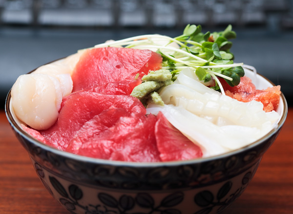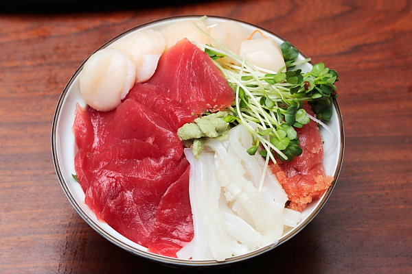 海鮮丼。まずはビールで。ワサビをつまみつつ、ホタテ、マグロなど。