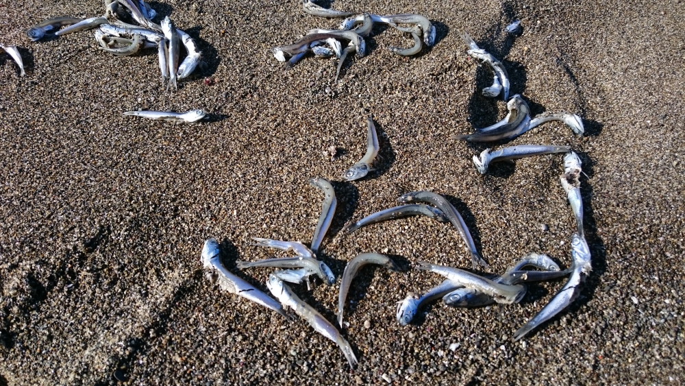 目の前の砂浜に散歩に行くと、実は昨日から知っていましたが打ち上げられたイワシが沢山いました。